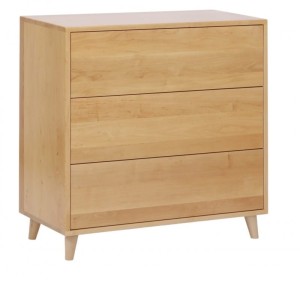 Komoda wyposażona jest w trzy przestronne szuflady, co czyni ją niezwykle praktycznym rozwiązaniem do przechowywania ubrań, tekstyliów czy innych domowych akcesoriów. Szuflady osadzone są na prowadnicach kulkowych z systemem „push to open”, dzięki czemu otwierają się po lekkim naciśnięciu frontu, bez konieczności stosowania uchwytów. Całość wsparta jest na smukłych nogach o wysokości 10 cm, co dodaje meblowi lekkości i ułatwia utrzymanie czystości pod komodą.