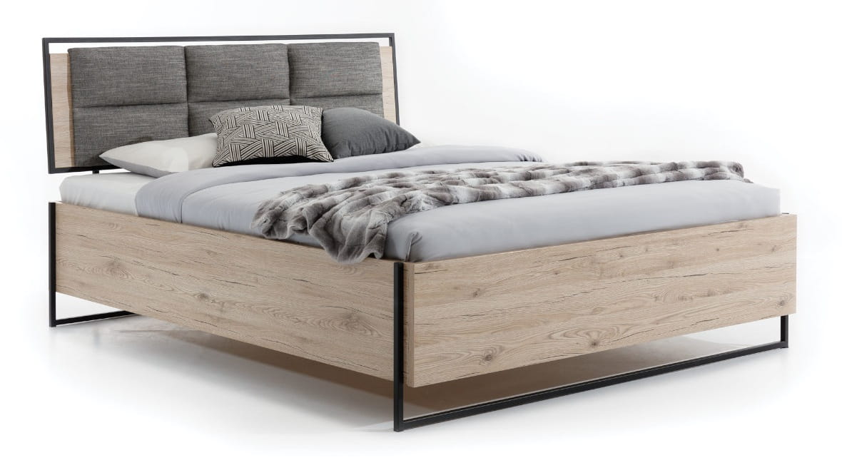 Loftowe łóżko z płyty meblowej w kolorze jasnego dębu z ciemnymi pęknięciami. Wygodny, miękki, pochylony zagłówek częściowo tapicerowany w kształt sześciu prostokątów. Czarna, metalowa rama okala wezgłowie oraz powtarza się jako ozdobny element stanowiący jednocześnie nogi łóżka.