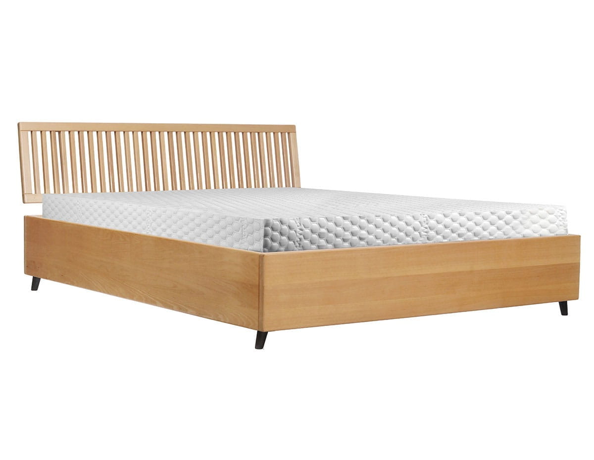 Łóżko RUKA PLUS to elegancki model wyposażony w praktyczny pojemnik na pościel, wykonany z litego drewna olchowego lub dębowego. Solidna rama z desek nadaje konstrukcji stabilności, a naturalny wygląd drewna podkreśla nowoczesny, a jednocześnie ponadczasowy charakter mebla.