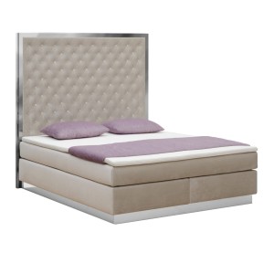 Piękne, tapicerowane wezgłowie łóżka kontynentalnego głęboko pikowane w kształcie rombów. Każdy romb wykończony ozdobną lamówką. Całe wezgłowie ujęte w elegancką ramę metalową chromowaną. Możliwość wyboru kilku korpusów oraz rodzajów nóg lub cokołu (pasujących do ramy wezgłowia). Łóżko dostępne w czterech szerokościach, a wezgłowie w dwóch wysokościach.