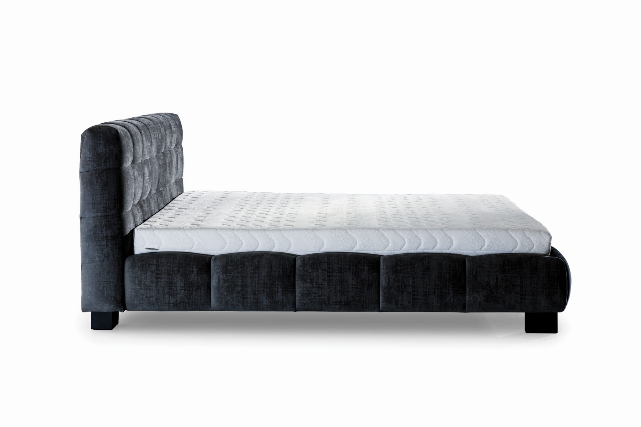 Niskie łóżko o kształcie wypukłych brzuszków na wezgłowiu oraz korpusie. Elegancki model dobrze wyglądający również pod niską ścianą.