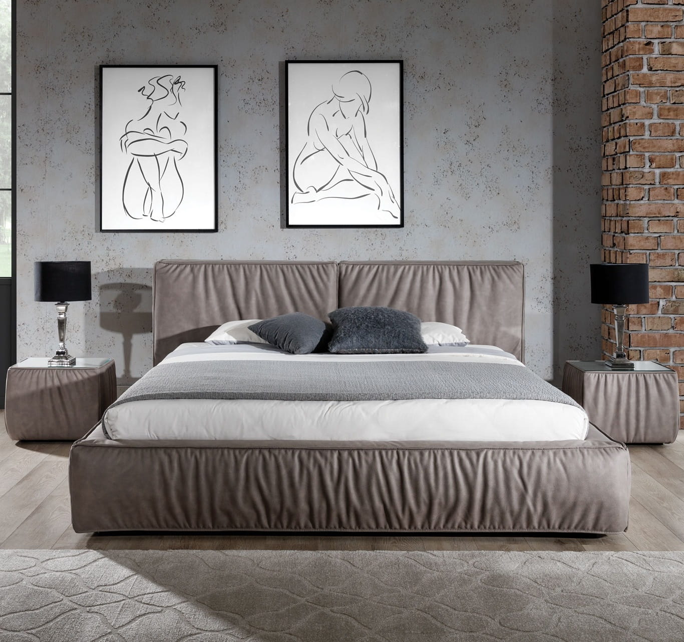 Kolekcja Bolsena to kolekcja mebli tapicerowanych, na która składa się interesujące, niskie łóżko tapicerowane oraz stoliki nocne utrzymane w tym samym stylu. Łóżko Bolsena to ciekawa, kubistyczna bryła, z grubym wezgłowiem dzielonym na dwie części i z grubymi bokami. Brzegi poduch oparciowych oraz boków wykończone ozdobnym szwem. Stoliki nocne nawiązują nonszalancją i luźnym marszczeniem do wyglądu łózka. Blat zabezpieczony transparentnym szkłem.