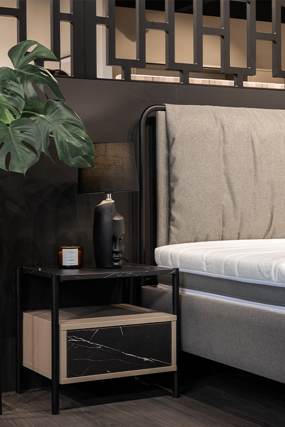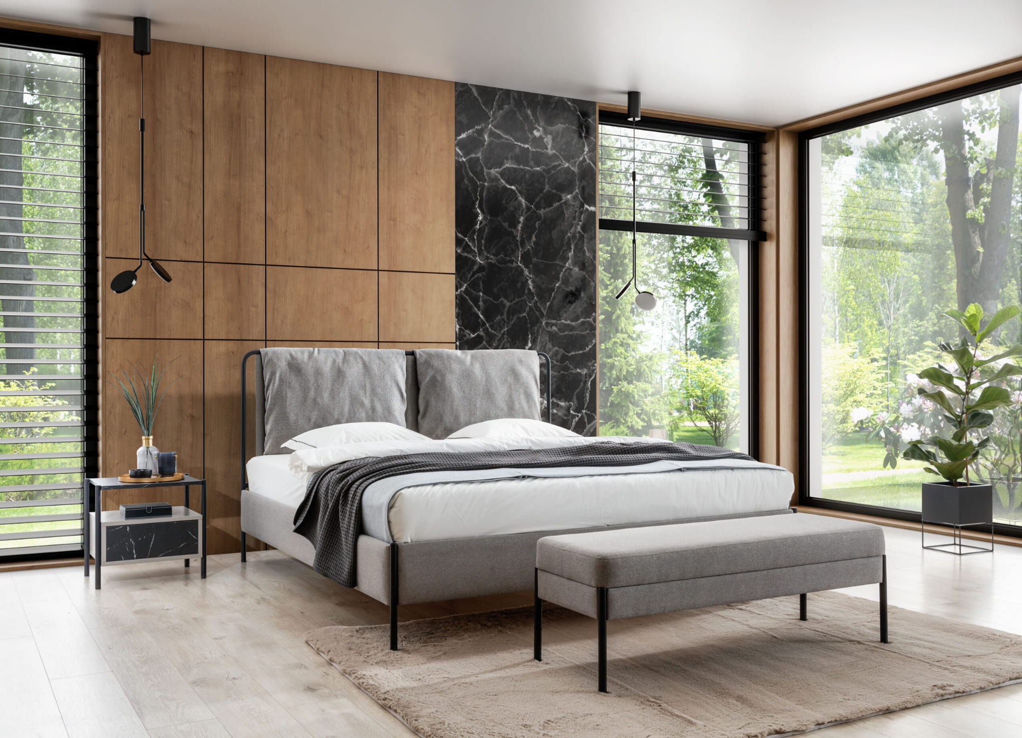 Oryginalna kolekcja Marmi przyciąga uwagę lekkością i nietypowymi rozwiązaniami konstrukcyjnymi. Podstawę łóżka stanowi metalowa, okrągła rama połączona ze sztywnym oparciem, na którym zawieszono miękkie, wygodne poduchy. Nieco nonszalancki wygląd łóżka przełamuje ciekawy stolik nocny wykonany z połączenia gładkich płyt meblowych i płyty meblowej imitującej czarny marmur. Całość łączy obecność czarnych, metalowych rurek – w łóżku są to nóżki oraz rama, w ławce i stolikach nocnych nóżki.