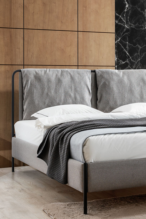 Niezwykle oryginalne, lekkie łóżko na konstrukcji z okrągłych, metalowych rurek. Wezgłowie sprawia wrażenie nonszalancko przewieszonych przez metalową konstrukcję, miękkich poduszek, w rzeczywistości za nimi znajdują się solidne, tapicerowane panele stanowiące bezpieczne podparcie. Czarne nóżki z okrągłych rurek, cofnięte w delikatną podstawę pięknie łączą boki i przód łóżka.