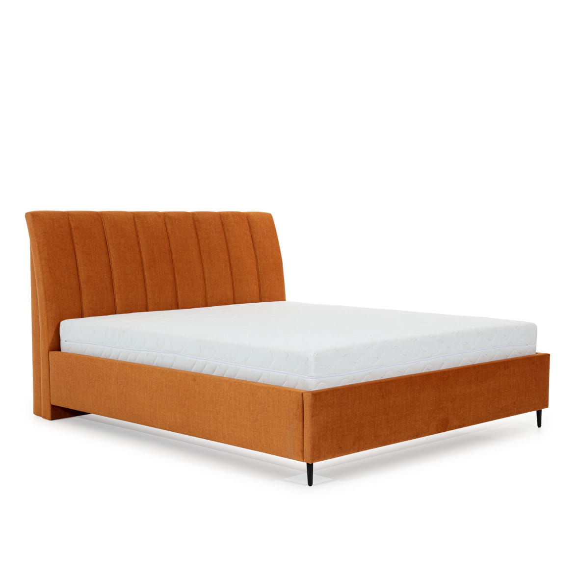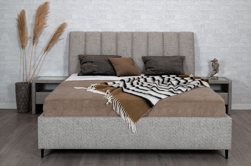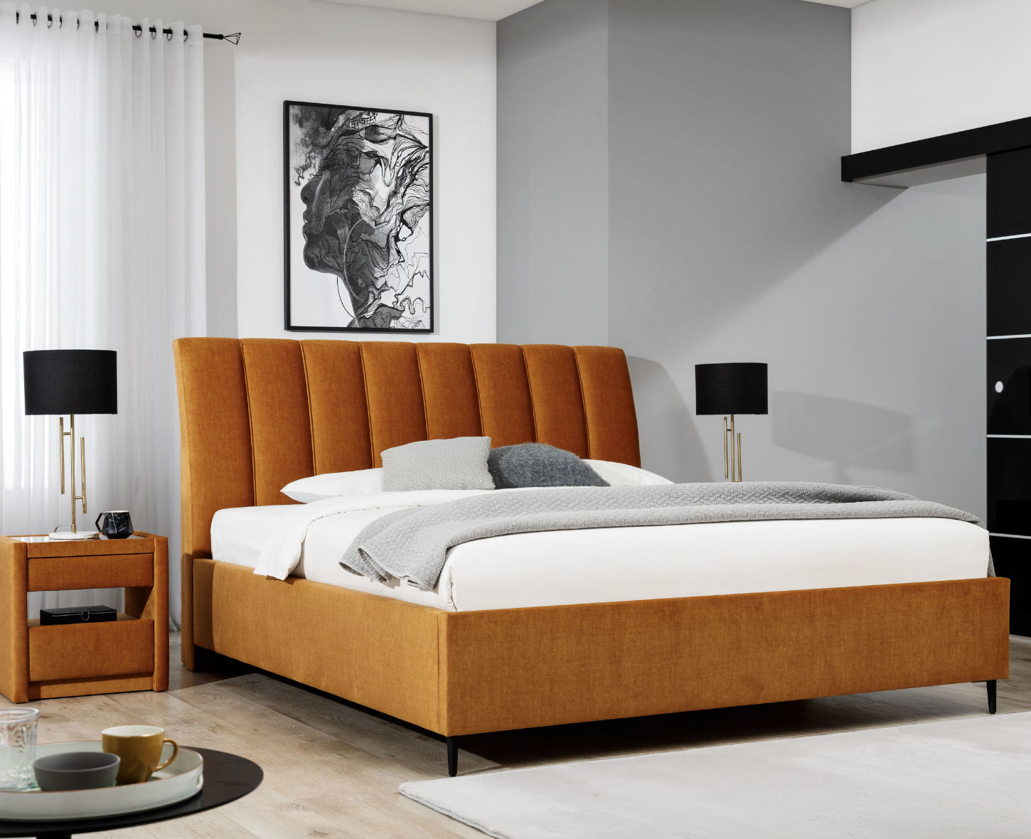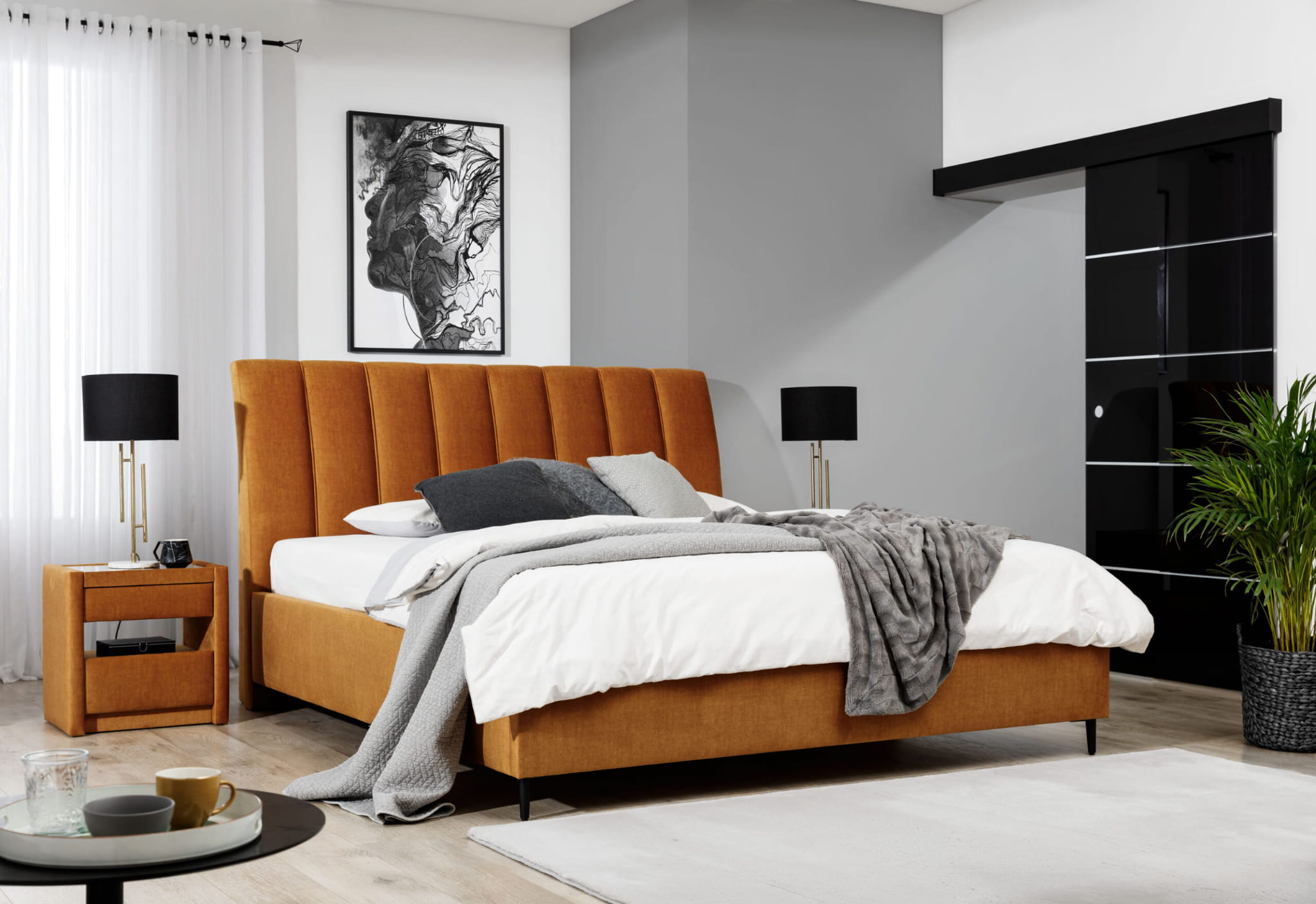 Łóżko tapicerowane z wysokim, lekko odchylonym i zaokrąglonym wezgłowiem pikowanym w pionowe pasy. Elementy pikowanego zagłówka oddzielają ozdobne lamówki. Prosta podstawa stanowi odpowiednie tło dla eleganckiego wezgłowia łóżka. Model występuje w wersji bez pojemnika i z pojemnikiem.