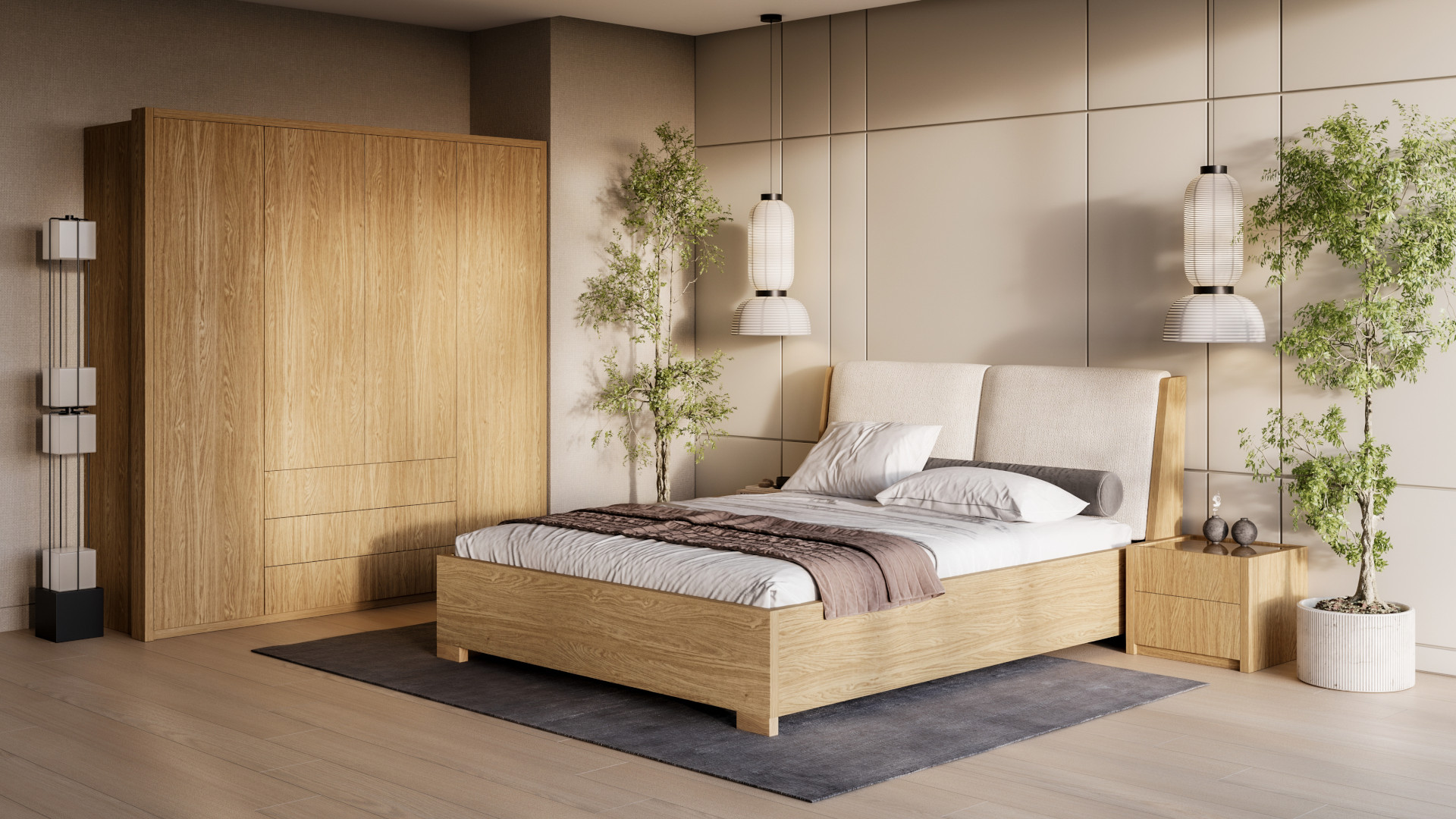 Kolekcja Modello 3.0 to nowoczesna kolekcja mebli do sypialni wykonanych z połączenia pięknej płyty meblowej w dekorze dąb Baltic Dune, przypominającej rysunek drewna. W skład kolekcji wchodzi bardzo wygodne łóżko z grubej płyty meblowej (38 mm) z wygodnymi, miękkimi poduchami w trzech odcieniach do wyboru (beż, krem, jasny brąz), uzupełniają je praktyczne szafki nocne z szufladami i szklanym blatem. Duża, czterodrzwiowa szafa z szufladami zewnętrznymi i komoda ze szklanym blatem stanowią doskonałe uzupełnienie zestawu.