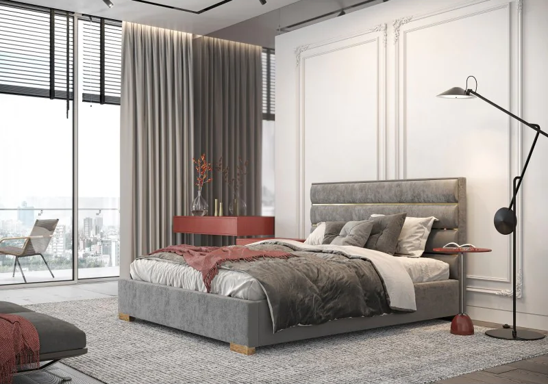 Łóżko Mona Gold to propozycja dla osób, które szukają połączenia nowoczesnego minimalizmu z eleganckim charakterem. Subtelne, poziome zdobienia w kolorze złotym na wezgłowiu wprowadzają do wnętrza poczucie ładu i równowagi, podkreślając jednocześnie nowoczesny styl mebla.