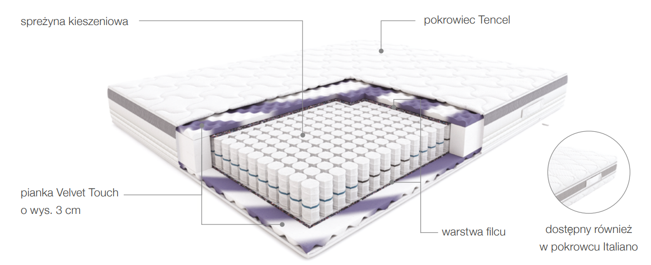 Materac dostępny w pokrowcu Tencel lub Italiano.