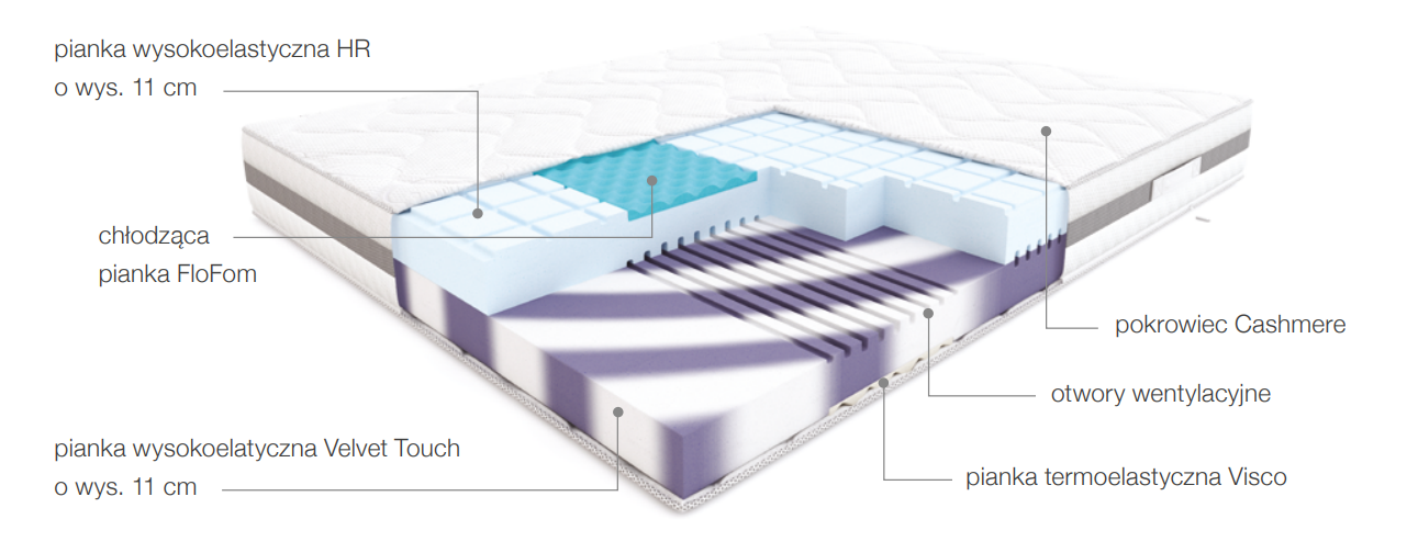 Wysoka elastyczność, sprężystość i wytrzymałość pianek HR sprawiają, że materac sprawdzi się również w przypadku osób o podwyższonej wadze, nawet do 130 kg.