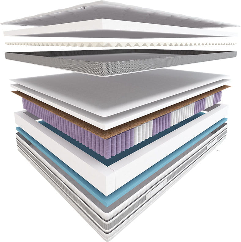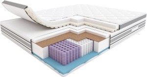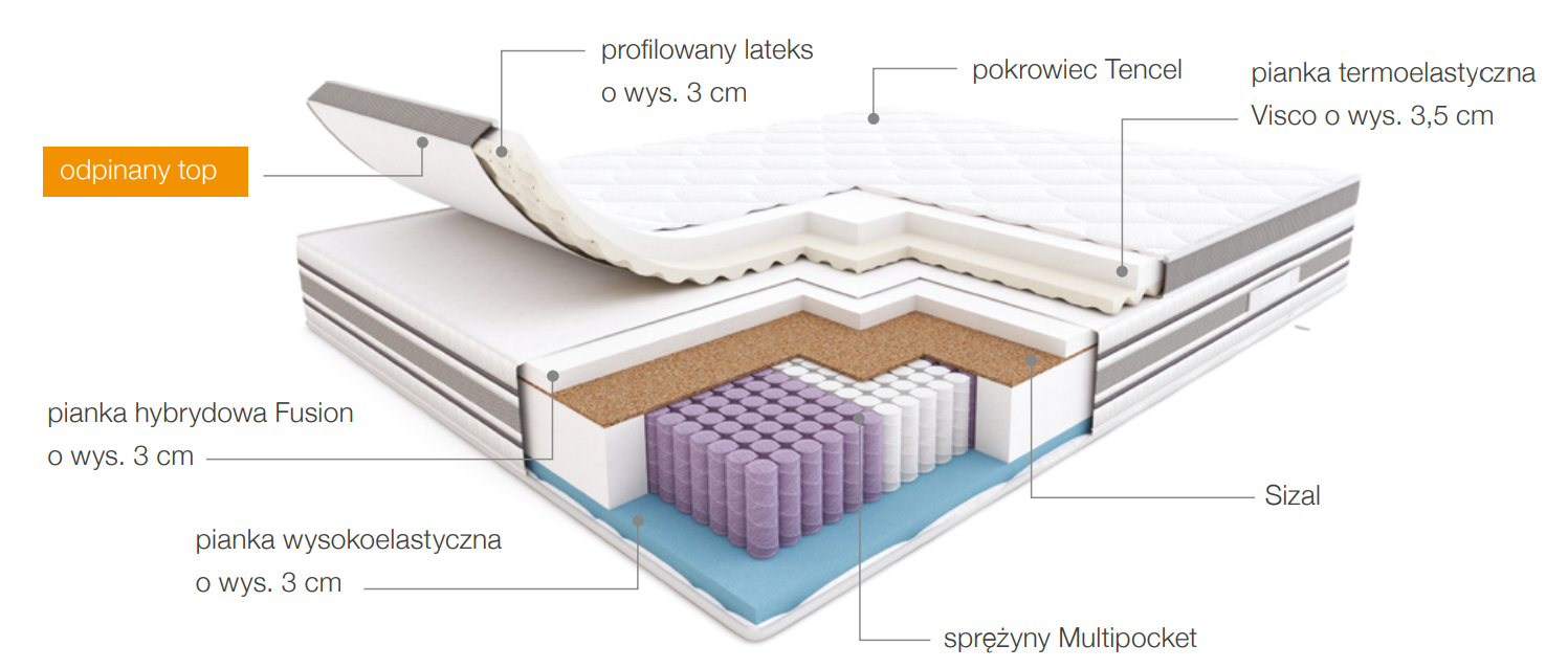Wkład: Baza - 7-strefowa sprężyna kieszeniowa Multipocket, po jednej stronie pianka wysokoelastyczna HR o wys. 4 cm, po drugiej stronie pianka hybrydowa Fusion o wys. 3 cm połączona z taflą Sizalu. Odpinany TOP: profilowany lateks o wys. 3 cm, pianka termoelastyczna.
