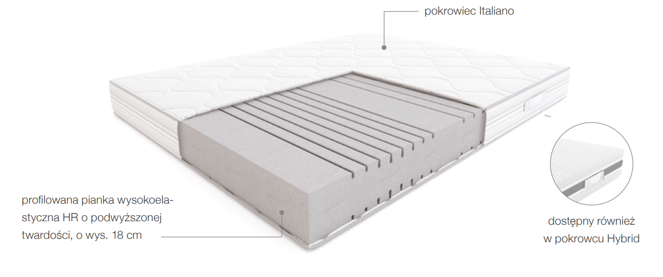Do wyboru pokrowiec Hybrid zapewniający doskonałą wentylację lub Italiano z innowacyjną technologią Purotex ograniczającą rozwój bakterii i roztoczy.