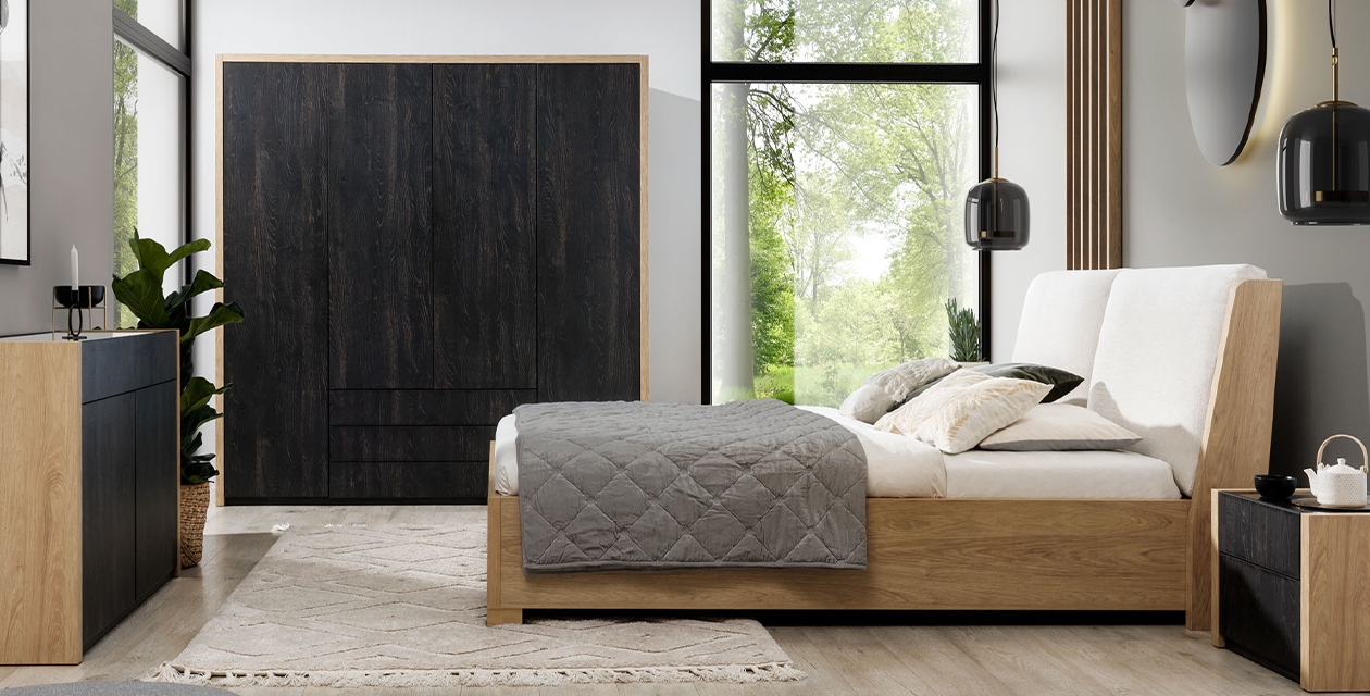 Kolekcja Modello 3.0 to nowoczesna kolekcja mebli do sypialni wykonanych z połączenia pięknej płyty meblowej w dekorze dąb Baltic Dune, przypominającej rysunek drewna. W skład kolekcji wchodzi bardzo wygodne łóżko z grubej płyty meblowej (38 mm) z wygodnymi, miękkimi poduchami w trzech odcieniach do wyboru (beż, krem, jasny brąz), uzupełniają je praktyczne szafki nocne z szufladami i szklanym blatem. Duża, czterodrzwiowa szafa z szufladami zewnętrznymi i komoda ze szklanym blatem stanowią doskonałe uzupełnienie zestawu.