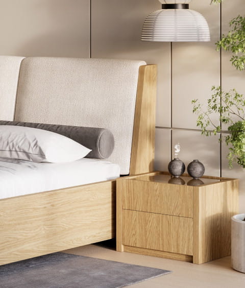 Kolekcja Modello 3.0 to nowoczesna kolekcja mebli do sypialni wykonanych z połączenia pięknej płyty meblowej w dekorze dąb Baltic Dune, przypominającej rysunek drewna. W skład kolekcji wchodzi bardzo wygodne łóżko z grubej płyty meblowej (38 mm) z wygodnymi, miękkimi poduchami w trzech odcieniach do wyboru (beż, krem, jasny brąz), uzupełniają je praktyczne szafki nocne z szufladami i szklanym blatem. Duża, czterodrzwiowa szafa z szufladami zewnętrznymi i komoda ze szklanym blatem stanowią doskonałe uzupełnienie zestawu.