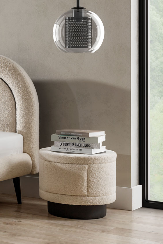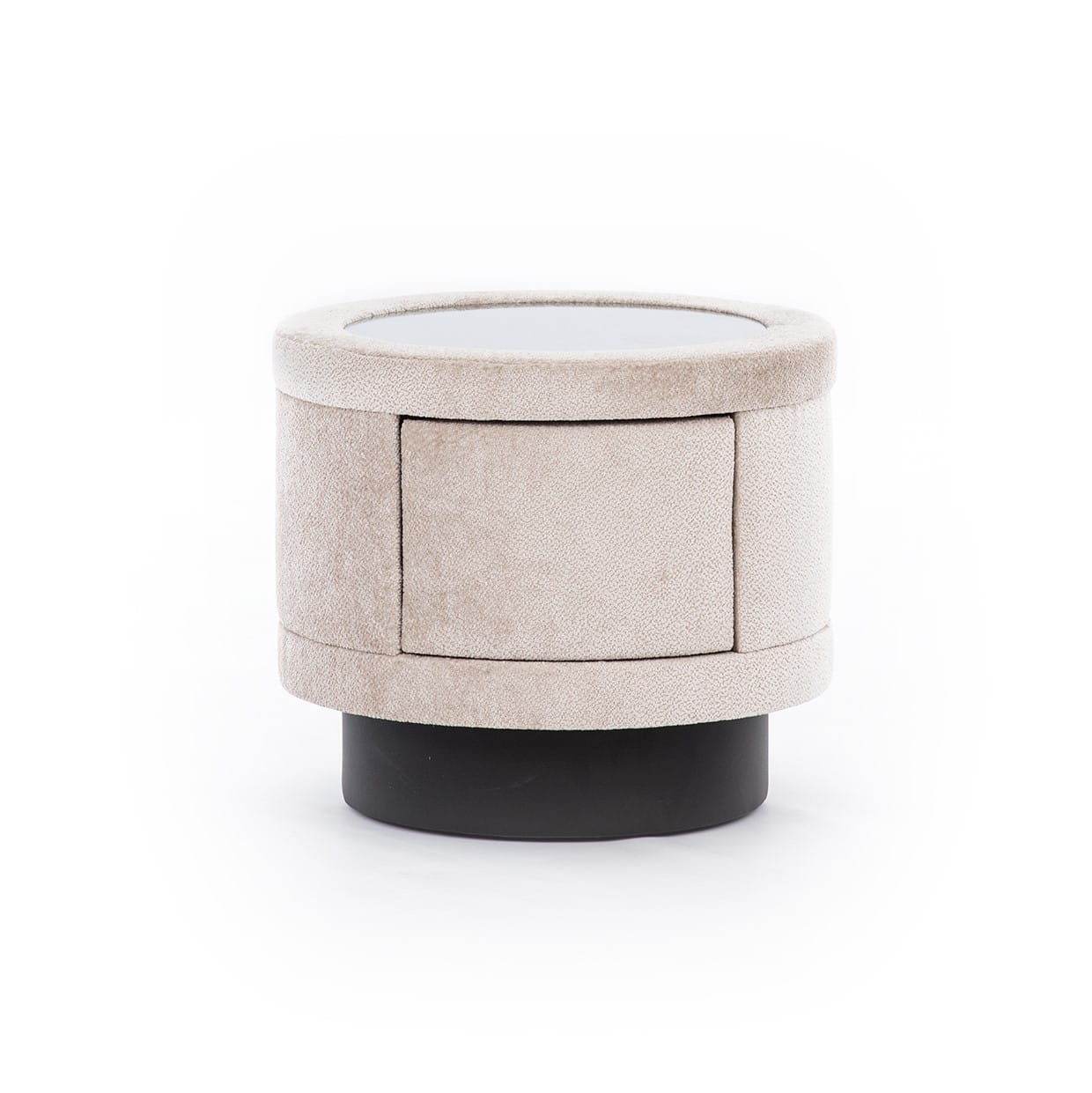 Tapicerowany stolik nocny o kształcie walca na czarnej, okrągłej podstawie. Blat zabezpieczony transparentnym szkłem, szuflada zamykana systemem push & pull.